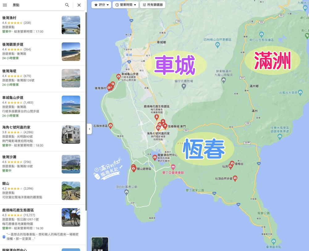 ✅恆春熱門景點:而恆春景點則相當適合玩水踏青,例如「關山觀景台」、「星砂灣」「貓鼻頭公園」、「南灣遊憩區」、「墾丁國家森林遊樂區」、「鵝鑾鼻燈塔」、「龍磐公園」等自然景點,晚上還可以去「墾丁大街」吃吃喝喝!