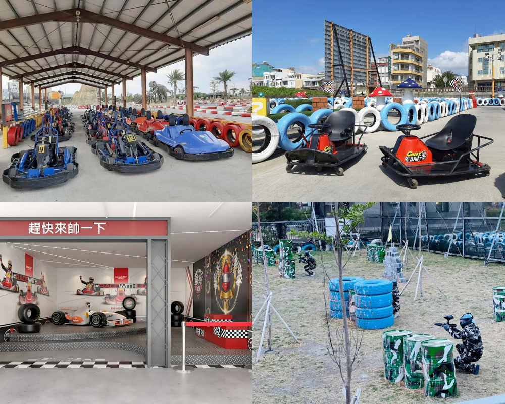 賽車場提供了F1卡丁車、馬力歐甩尾車、極限沙灘車三種車型,帶著小朋友可以選擇雙人座的F1卡丁車,跑道兩側皆設有輪胎防止碰撞帶來的危險。此外現場還有漆彈、水彈可以來場生存對戰,是個讓大人小孩都可以玩得盡興又開心的景點。